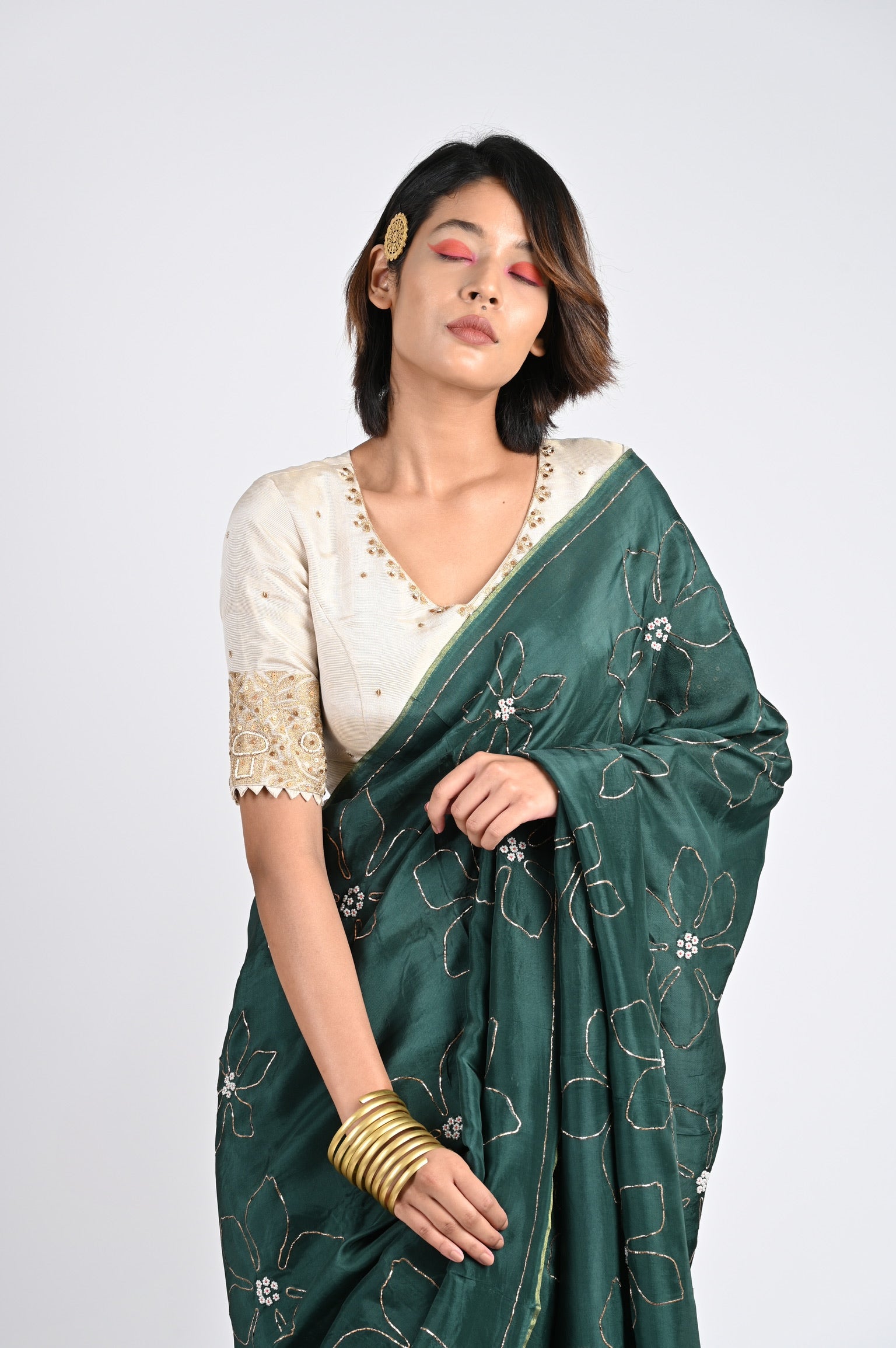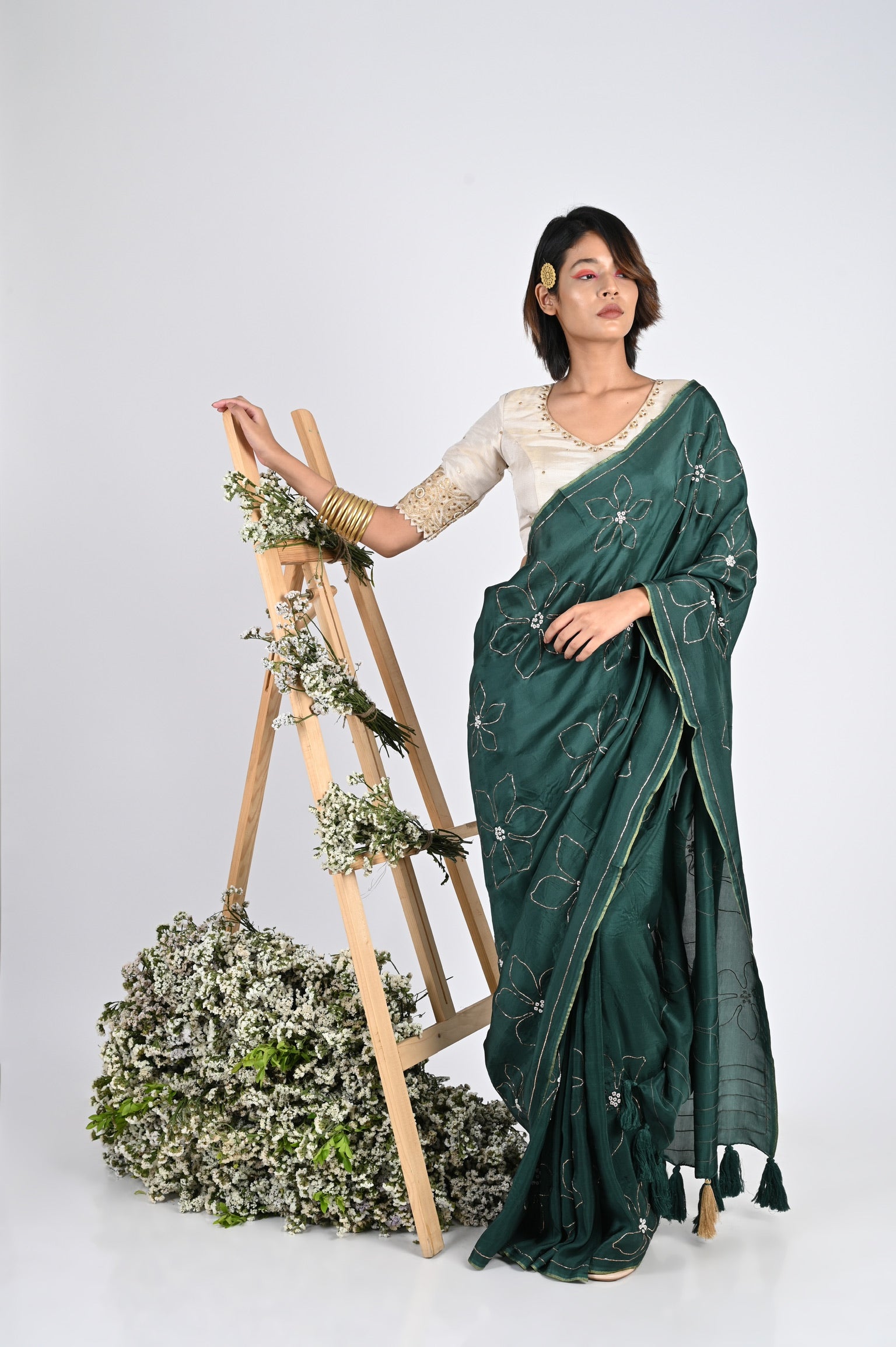 Featuring an emerald green saree in silk base with rose peta zardosi embroidery. It is paired with a monochrome blouse.      DISCLAlMER   • This product will be exclusively handcrafted for you, making the colour/texture/pattern...