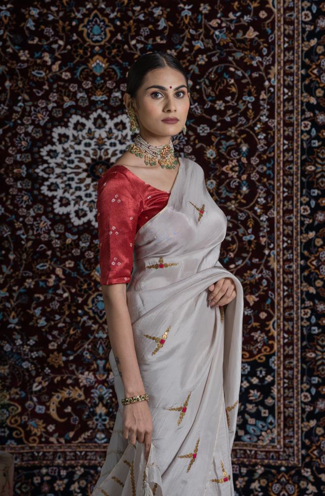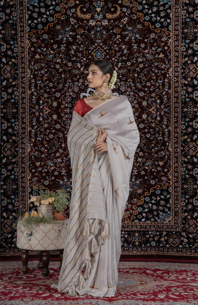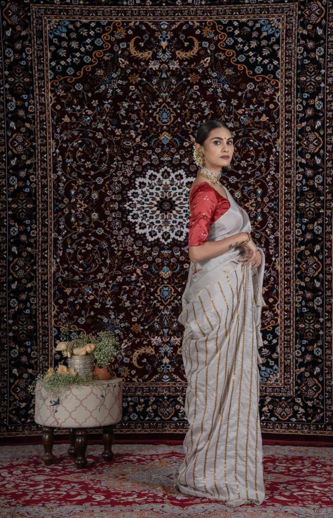 Featuring a silver metallic saree in silk base with golden zari & coin embroidery. Monochrome blouse piece.    DISCLAlMER      • This product will be exclusively handcrafted for you, making the colour/texture/pattern slightly vary from...