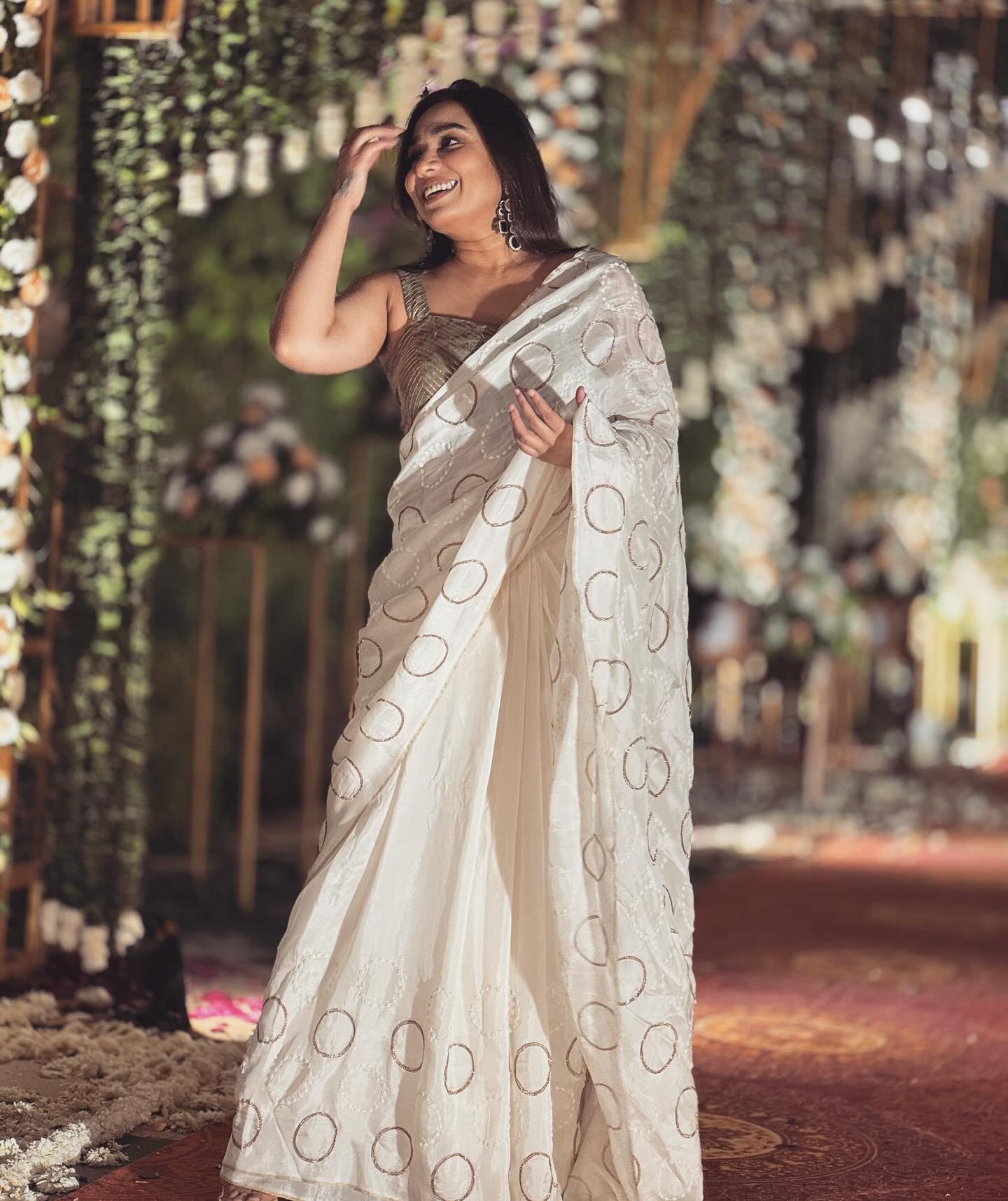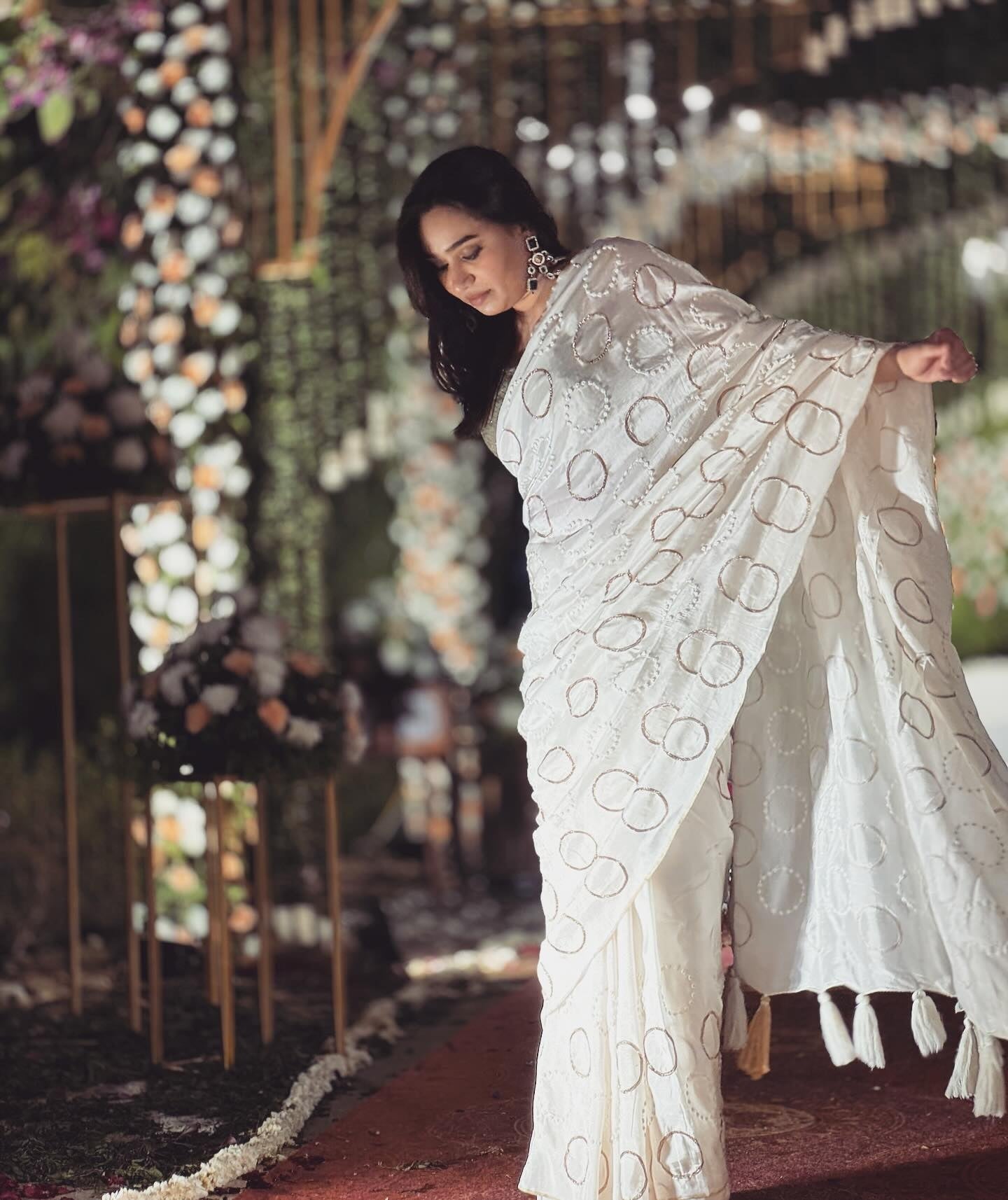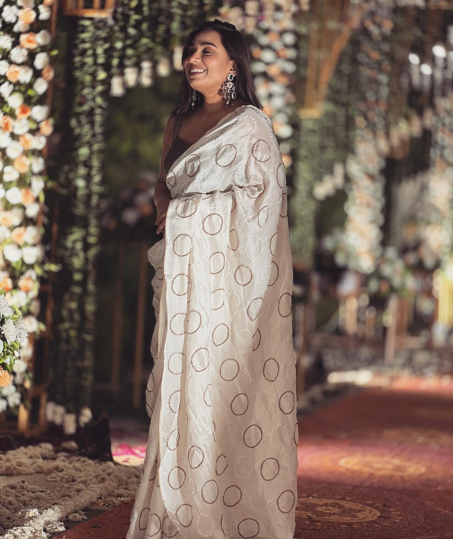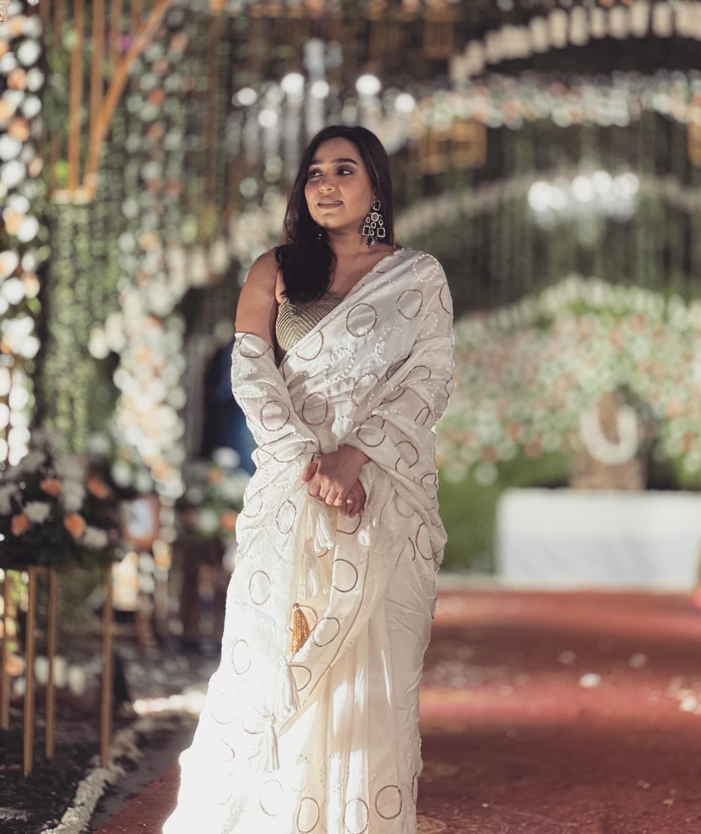Ivory saree in silk base with pearl and zardosi and an attached monochromatic blouse.