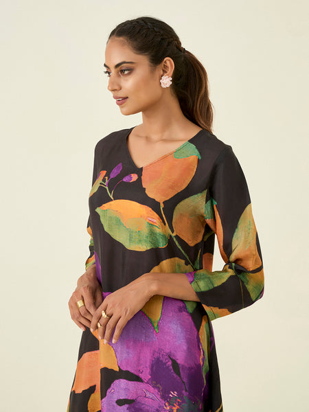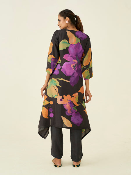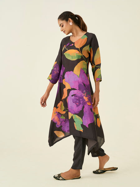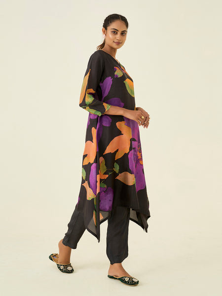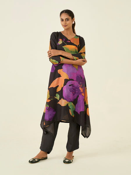 Crafted from a lightweight Habotai fabric, this two-piece ensemble features a relaxed-fit kurta adorned with a floral Ptint.