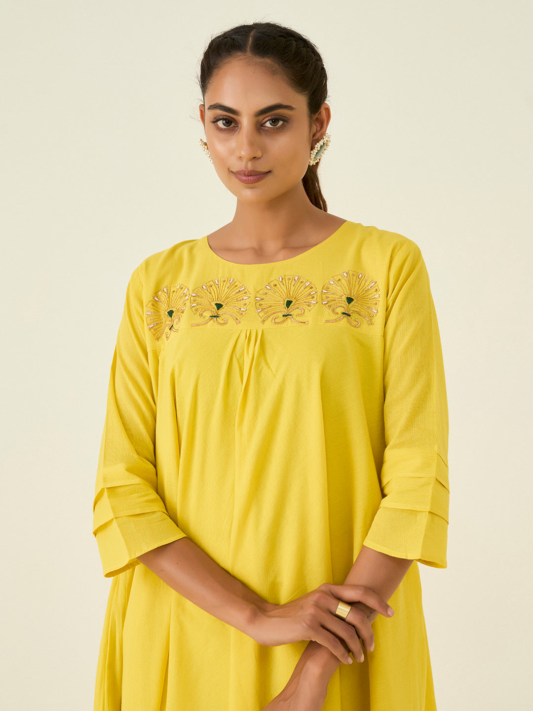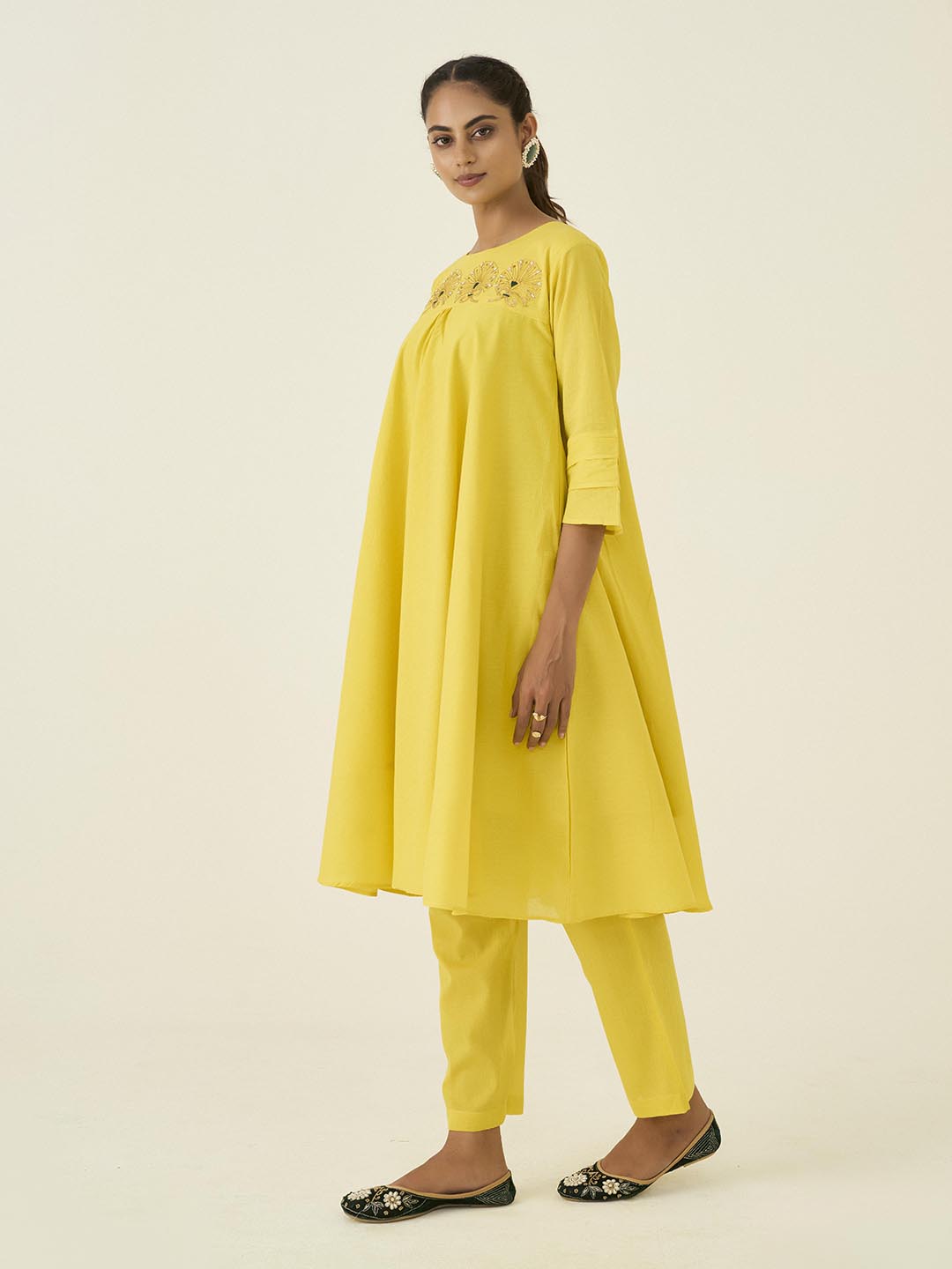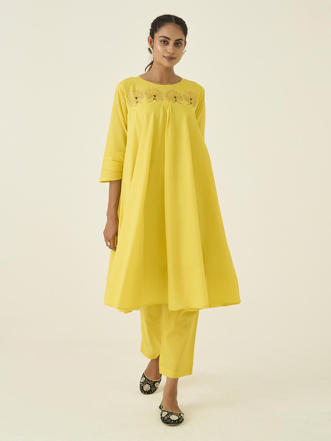 Crafted from a lightweight mal cotton fabric, this two-piece ensemble features a relaxed-fit kurta adorned with a hand embroidered -style floral work in gold Zardozi pita work.